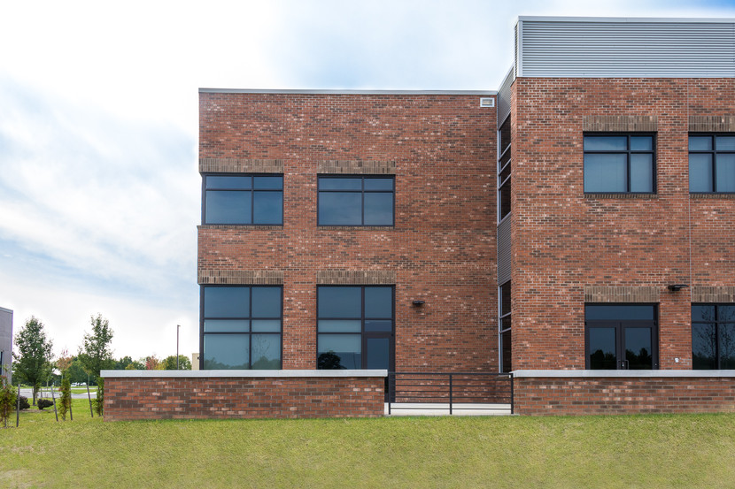 The exterior blends a mix of brick, the iconic Hokie Stone and corrugated metal siding to complement the existing material pallet of the research park.
